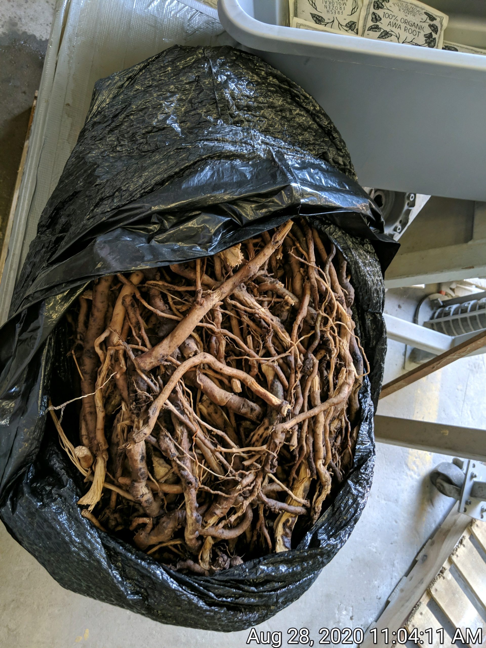 We had an opportunity to run a root ball of kava in Tampa. This was a 35 pound ball of kava from Hawaii which was harvested, washed of all mud, and frozen for transport. Once thawed, it was easy to unfold the roots and spread them out. The moisture content measured 78%, and it was easy to squeeze out some “juice” by twisting pieces of root by hand.