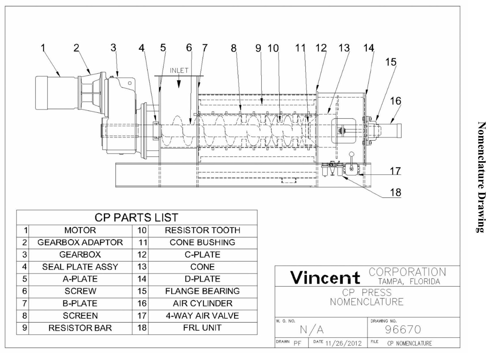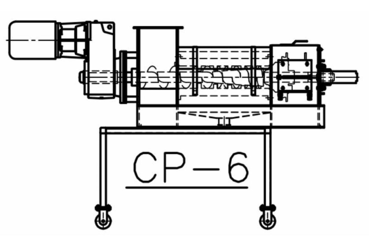 The Vincent KP Press consists of a screw rotating within a screen housing, a flanged inlet hopper, and a discharge opening. At the discharge end, the mouth of the screen housing is closed by a pneumatically actuated cone which moves back and forth on the screw shaft in proportion to the internal pressure in the screen frame. This motion is opposed by the cone cylinder thrust, thereby regulating the discharge of solids. An air regulator is provided to adjust the pressure on the cone. The liquids, which are squeezed from the wet product, escape through the screen housing and are caught in a built-in pan under the screen.