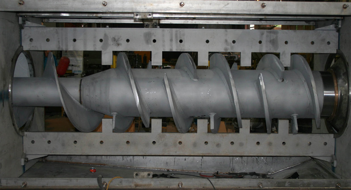 Most Vincent screw presses use the Interrupted Flight Screw design. The interruptions leave room for stationary resistor teeth that are mounted outside of the screen. These teeth go through the screen and reach almost to the shaft of the screw. This design of screw press stands in contrast to a Continuous Screw design. The main advantage of the interrupted design is that solids material must accumulate in the interruptions until sufficient consistency is reached for the solids to be pushed toward the cake discharge. There is a reduced tendency for the material being pressed to co-rotate with the screw. Also, there is more agitation within the press and, consequently, quicker and more thorough dewatering. Pushing the material through the compression zones past the resistor teeth will also shred the material a bit.