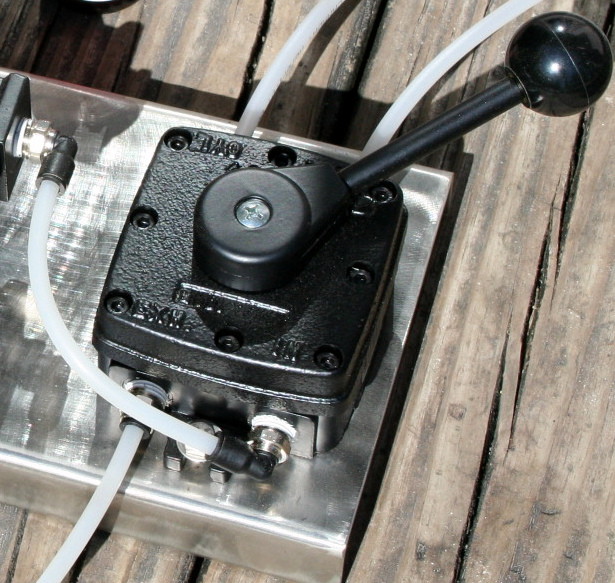 The Parker valve allows manual selection of the shut, open, or “neutral” position. This valve connects air supply from the regulator to one end of the air cylinder, while simultaneously opening the other end to atmosphere. The vent line on the 4-way valve allows air to escape when pressure is switched from one end of the air cylinder to the other.