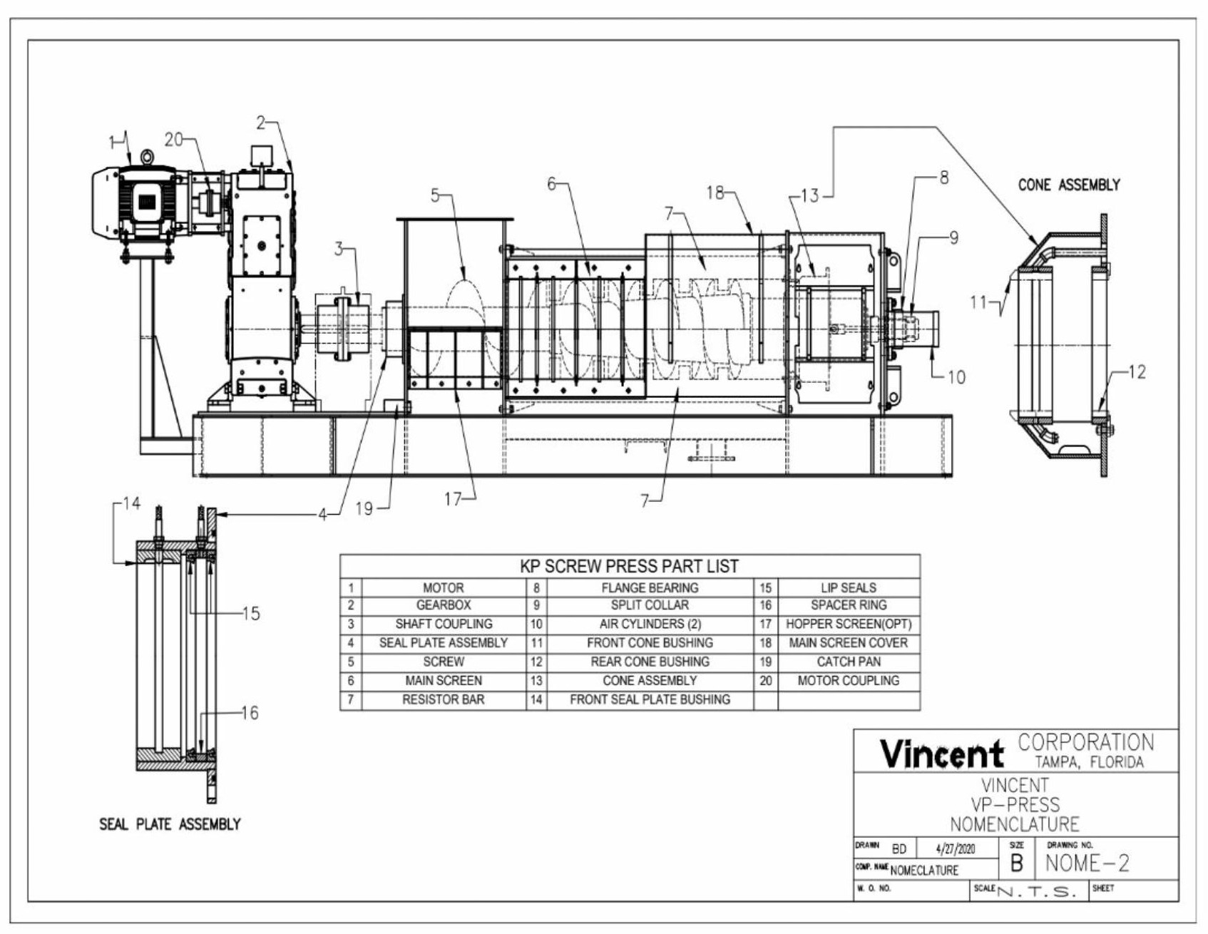 The Vincent KP Press consists of a screw rotating within a screen housing, a flanged inlet hopper, and a discharge opening. At the discharge end, the mouth of the screen housing is closed by a pneumatically actuated cone which moves back and forth on the screw shaft in proportion to the internal pressure in the screen frame. This motion is opposed by the cone cylinder thrust, thereby regulating the discharge of solids. An air regulator is provided to adjust the pressure on the cone. The liquids, which are squeezed from the wet product, escape through the screen housing and are caught in a built-in pan under the screen.