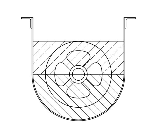 The spreadsheet assumes that the conveyor will be filled to the very top of the flight of the screw (or paddle or ribbon). The cross section of that mass would be a semi-circle from the center of the shaft to bottom of the trough, plus a rectangle from the center of the shaft to the top of the flights. We do not subtract volume to allow for space take up by the shaft and flights of the conveyor. The sketch below illustrates this.